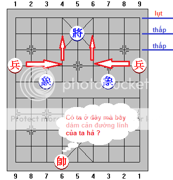 Nhưng trong thực chiến không phải lúc nào ta cũng có 2 Chốt cao. Trường hợp 1 Chốt lụt thì khỏi bàn, không cách chi thắng được. Còn nếu 1 Chốt cao và 1 Chốt thấp thì sao ? Vẫn là thắng chắc, nhưng Đỏ phải đi Chốt cao thật cẩn thận, hướng đánh cũng tương tự trường hợp 2 Chốt cao - dùng Tướng yểm trợ Chốt thấp kẹp vào và Chốt cao tiến xuống. Lưu ý: vẫn nên điều 2 Chốt chiếm 2 lộ sườn.