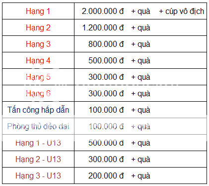 . Dành cho các vđv U13 (sinh từ năm 1999 trở lại đây): Nếu có từ 6 vđv U13 trở lên đăng ký tham dự, BTC sẽ trao thưởng 3 vđv U13 có hạng cao nhất so với các vđv U13 khác (xem chi tiết trong bảng giải thưởng ở ngay phía trên).