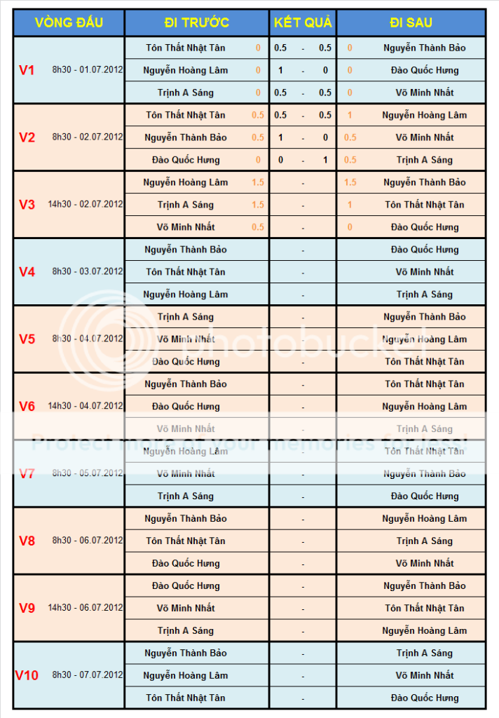 Xếp hạng cá nhân lần lượt theo: tổng số điểm (điểm ván là 1), hệ số vòng tròn Sonneborn Berger, số ván thắng, số ván đi sau thắng, ván đối kháng.