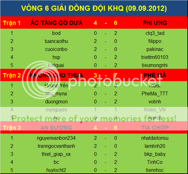 Vòng 6 tiến hành thi đấu vào lúc 9h sáng chủ nhật 09.09.2012 tại kỳ đài Huy Công.