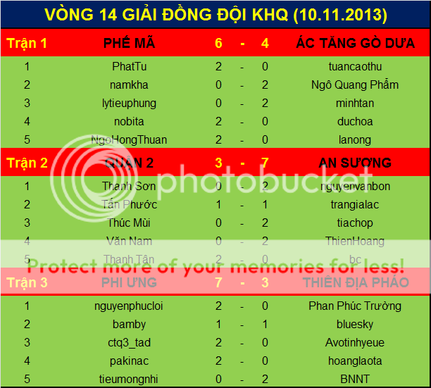 Vòng 14 tiến hành thi đấu vào lúc 9h sáng chủ nhật 10.11.2013 tại nhà hàng Nam Phương.